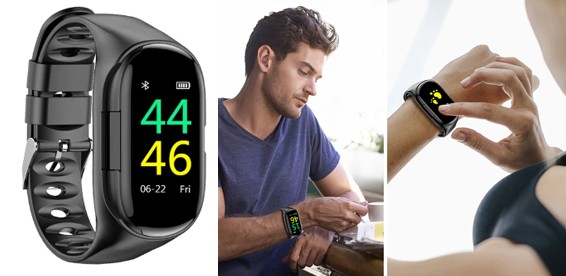 Внешне новинка похожа на рядовой фитнес-трекер с дисплеем. Отличается она лишь толстым корпусом. Причина тому – возможность хранения зарядки беспроводных наушников непосредственно внутри браслета.